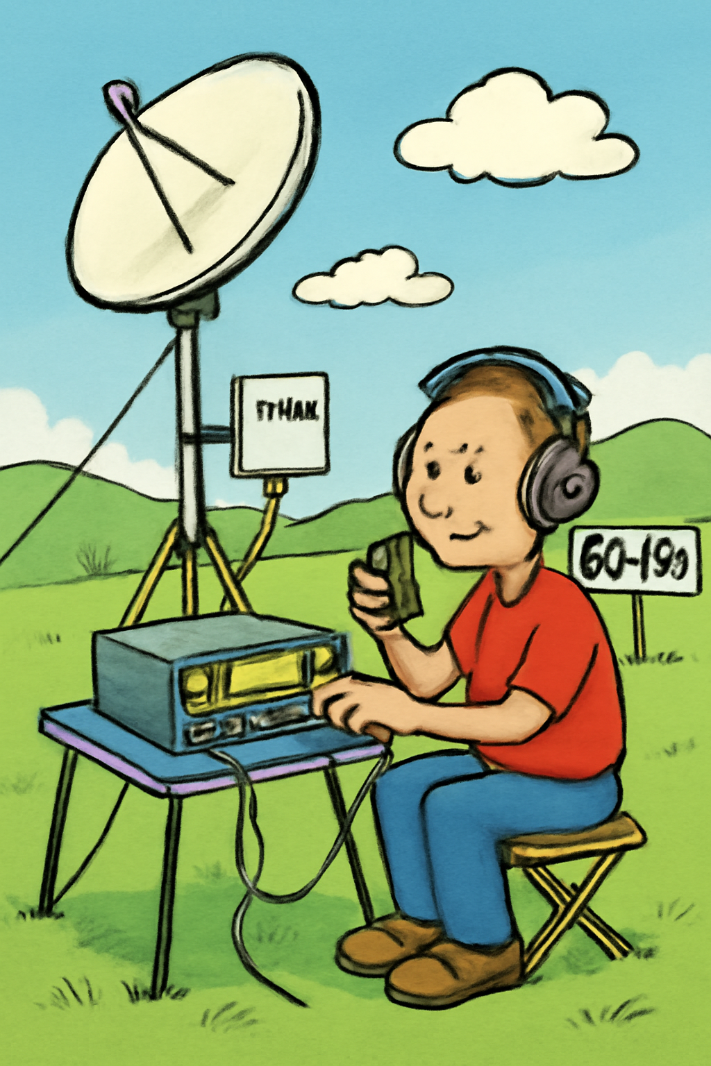ein QSO via QO100, es werden von uns ein oder zwei QO100-Stationen von uns aufgebaut oder